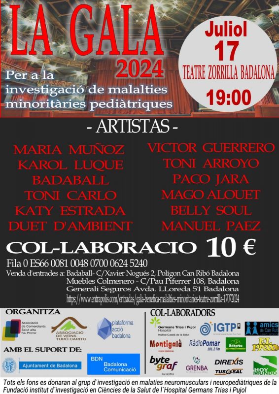 Amb el mateix propòsit, l’Associació de Comerciants Pau Piferrer juntament amb l’Associació de Veïns Turó del Caritg i la Plataforma Acció Badalona organitza el proper 17 de juliol una Gala benèfica al Teatre Zorrilla de Badalona. A la gala hi participaran diversos artistes de la zona i el recaptat es destinarà a la recerca en malalties minoritàries pediàtriques. Si vols assistir, pots comprar les entrades aquí.