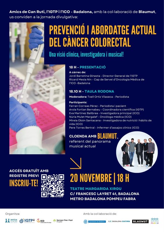 El 20 de novembre al Teatre Margarida Xirgu de Badalona se celebrarà la jornada divulgativa “Prevenció i abordatge actual del càncer colorectal. Una visió clínica, investigadora i musical”, organitzada per Amics de Can Ruti, l’Institut de Recerca Germans Trias i Pujol (IGTP), l’Institut Català d’Oncologia (ICO) – Badalona, i amb la col·laboració del grup musical Blaumut.