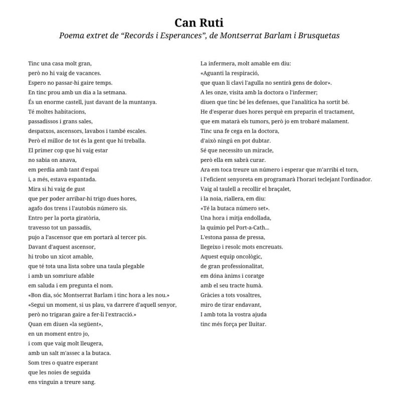 Montserrat Barlam i Bruquetas ha destinat la recaptació del seu poemari “Records i esperances” a Amics de Can Ruti, específicament, a la recerca en càncer que es realitza en l’Institut Català d’Oncologia (ICO) al Campus Can Ruti. Amb els seus poemes publicats en el 2021, Montserrat reflexiona sobre la seva vida i la seva experiència amb la malaltia, buscant acompanyar a través de les seves paraules a altres pacients que, com ella, són tractats dia a dia a l’Hospital Germans Trias.